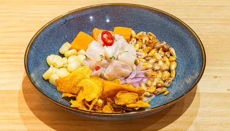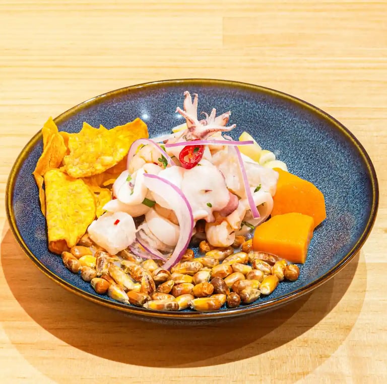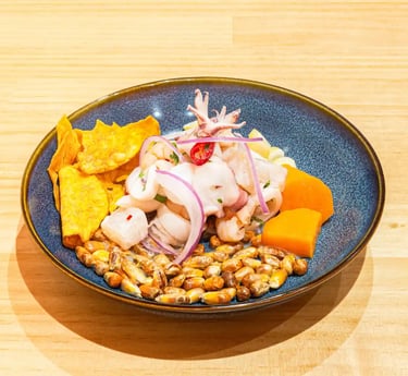 Delicie-se com o nosso ceviche cuidadosamente preparado, repleto de sabores frescos e ingredientes peruanos autênticos.